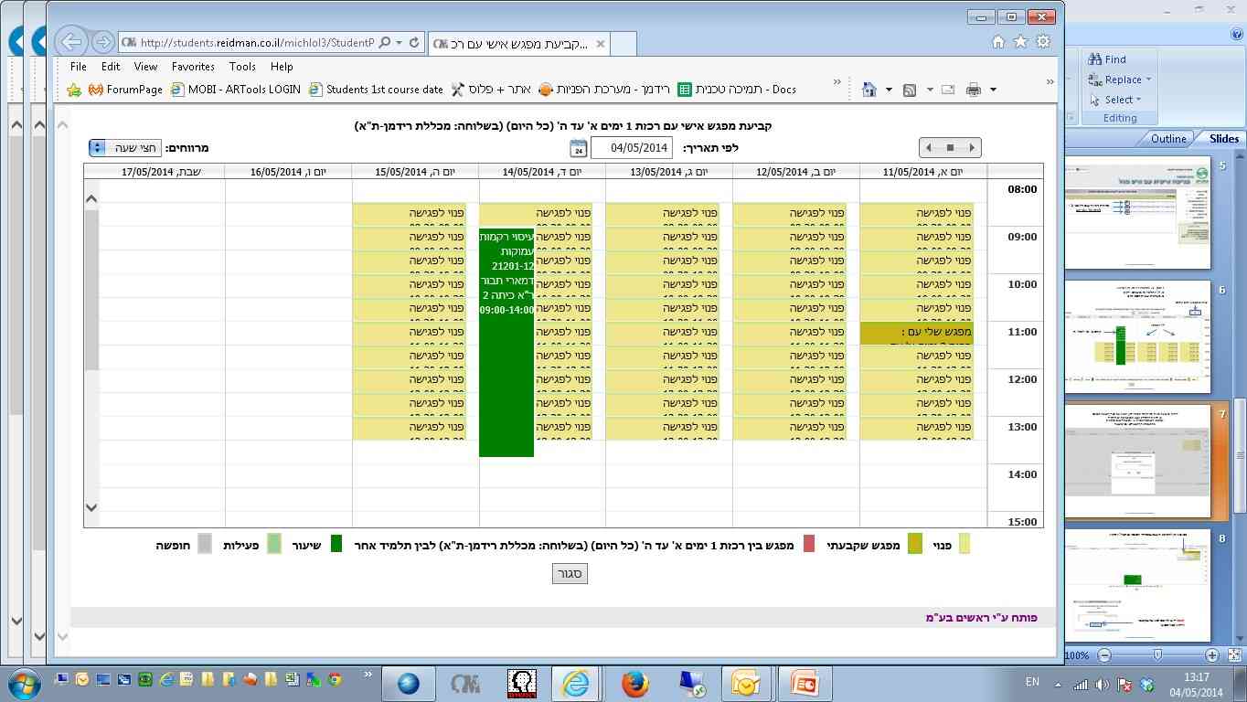 במסך זה מוצג לו"ז הרכזות השבועי, לנוחיותכם אנא בחרו את הזמן שמתאים עבורכם מתוך האפשרויות הפתוחות