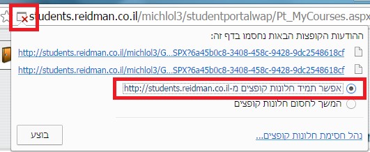 הדפדפן חסם חלונות קופצים. עליך לאפשר חלונות קופצים בכל מערכות רידמן - החסימה תופיע בראש העמוד בשורת הכתובת. יש ללחוץ על ה-x ובחלונית לסמן "אפשר תמיד חלונות קופצים מאתר רידמן" כמוצג בצילום הבא: